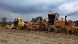 压路机打滑走不了,看看重型平地机如何将其拉出来