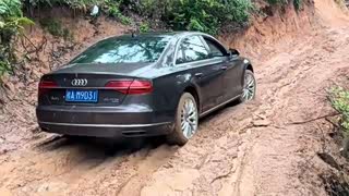 奥迪A8L司机不听劝,要来爬烂泥坡,一脚油门下去尴尬了