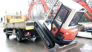 来看看小型挖掘机是怎么爬上板车的