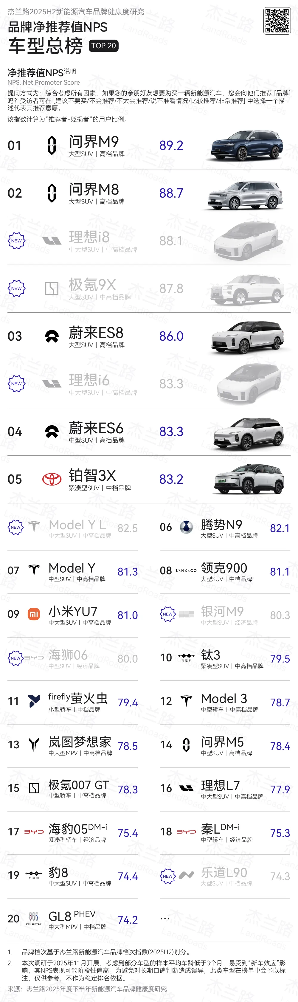 近日,杰兰路 2025 年度下半年新能源汽车品牌健康度研究报告公布,问界 M5 作为问界推出的首款车型,依然具有极强的NPS和产品实力!跻身车型总榜排名TOP 14,在中型 SUV 品类净推荐值(NPS)排名中跻身 TOP 3。研究报告特别指出,随着产品焕新完成,问界 M5 的净推荐值实现显著跃升!问界品牌已站稳高档品牌阵营,成为消费者心中极具认可度的信心品牌。凭借硬核的产品实力与适配多元用车场景的出众表现,问界M5目前已收获超 15 万用户的深度青睐,赢得市场的广泛认可。
