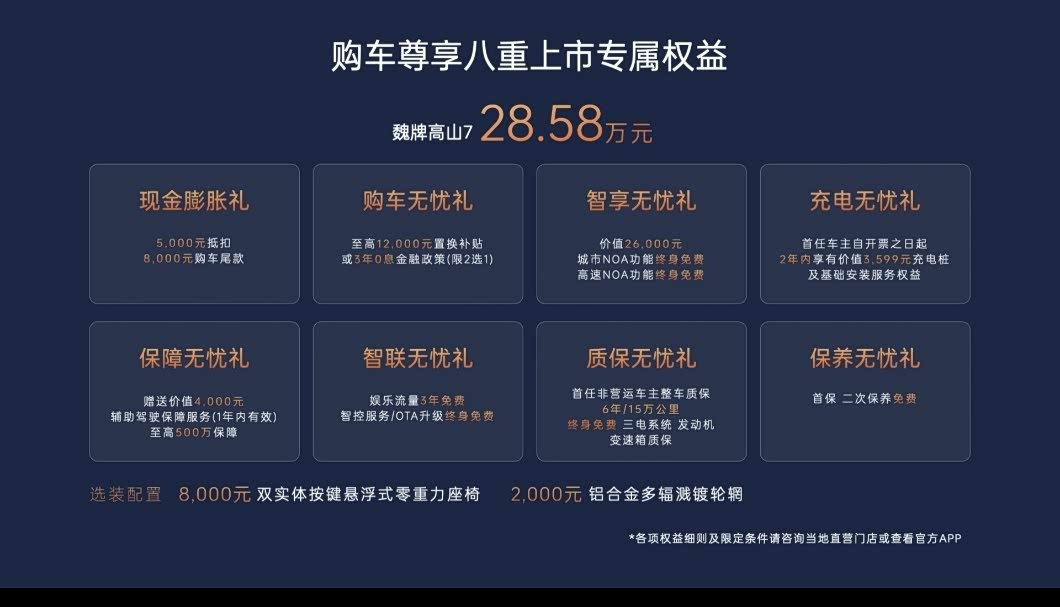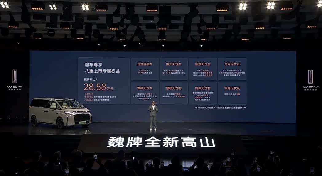 #魏建军称服务用户没有完成时# #魏牌高山7正式上市# 28.58万元 #一家人的移动大客厅#高山7动力性能方面搭载新一代混动引擎,最大功率320kW,峰值扭矩680N·m,百公里加速仅4.9秒,兼顾爆发力与续航平衡,征服崎岖如履平地。智能四驱系统联动7种驾驶模式,冰川泥泞、沙漠陡坡皆从容应对。 智能交互反面,27英寸超感曲面屏+AR-HUD,配合AI语音助手“星瞳”,实现“眼动+手势+声控”三维交互,指令响应毫秒级精准。 智能辅助驾驶部分,全域雷达与高精地图融合,自动泊车、高速领航、紧急避障全场景覆盖,让每一次出行皆如私人管家随行。 舒适空间部分,零重力座椅,Nappa真皮包裹,配备16向电动调节+热石按摩功能,CN95级空气净化系统+负离子香氛,森林级氧吧环境。