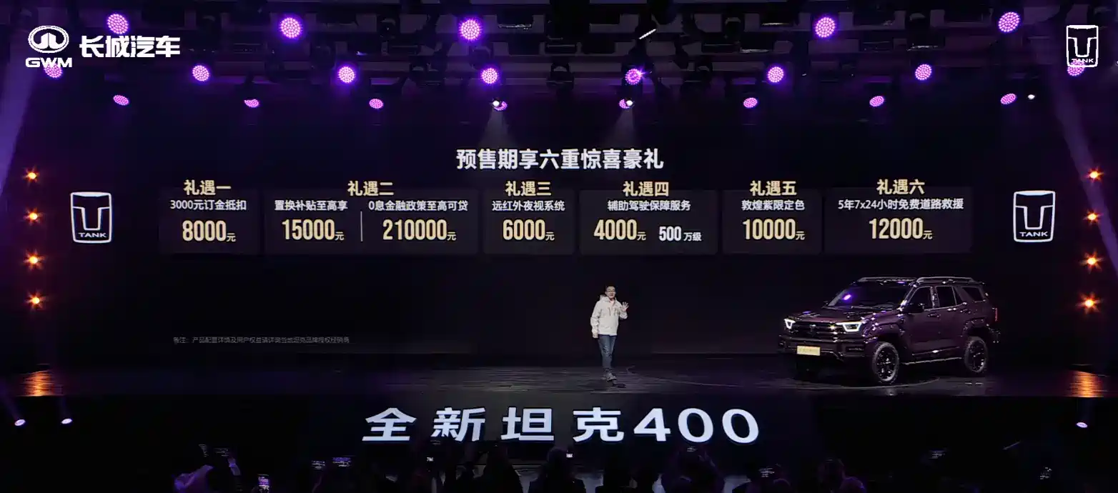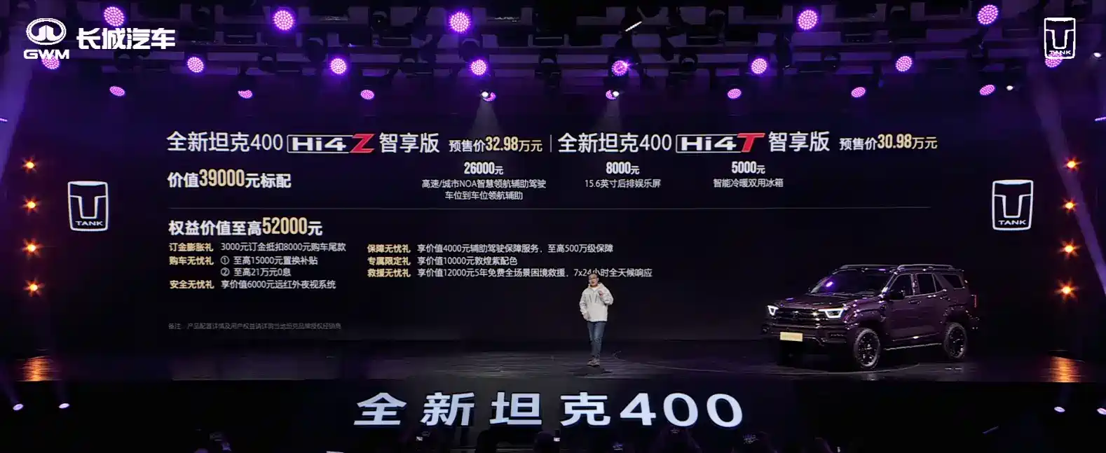 全新坦克400正式预售,Hi4-T和Hi4-Z两种动力,预售价分别为30.98万元和32.98万元。新款坦克400智享版车型将配备激光雷达,搭载第三代CoffeePilot Ultra辅助驾驶系统。另外,新款坦克400还对车辆外观和内饰细节进行调整,并新增全新“敦煌紫”车色。 值得注意的是,智享版搭载第三代Coffee Pilot Ultra辅助驾驶系统,侧面增加侧视摄像头,支持城市NOA、高速NOA等功能,尾灯位置还配备了辅助驾驶“小蓝灯”。