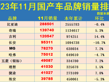 11月自主品牌销量榜TOP50:比亚迪吉利大增,奇瑞理想同比翻倍!