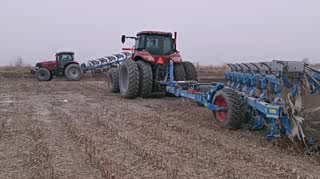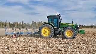 新旧两台约翰迪尔8R车型,一翻一耙地清理麦茬地准备春播