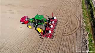 无人机航拍,约翰迪尔拖拉机播种甜菜格兰多行精量播种机