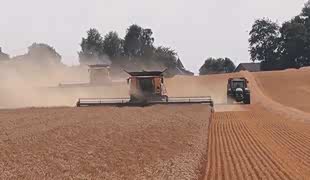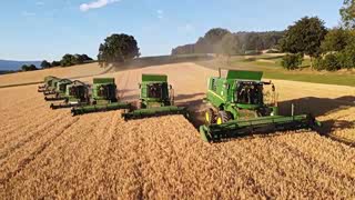 来自德国的收割机作业队航拍队形 清一色的约翰迪尔配置