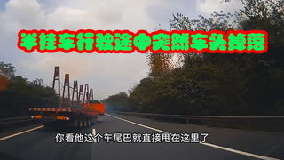 一辆半挂车在高速行驶途中突然车头掉落,留下车厢车头扬长而去