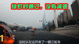 绿灯时通过,没有减速,低估了三轮车闯红灯的能力,这下吃大亏了