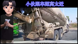 小伙跟车距离太近,突然前面的水泥罐车倒车,差点来不及后退