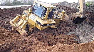 淹没在泥泞路中的推土机,装载机挖掘车乌拉尔起重机牵引出来