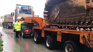 惊人的重型运输!两辆卡车拉一台155吨挖沟机,看看怎么运输的