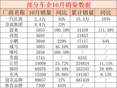 13家车企10月销量 奇瑞大涨达8.8万 别克10万蔚来翻番