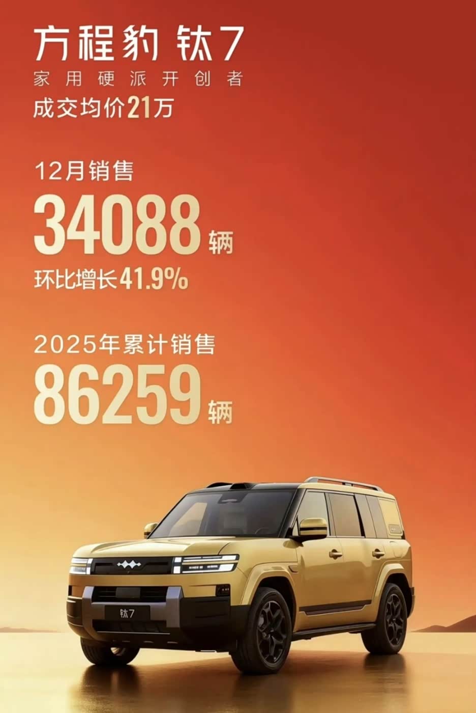 牛掰克拉斯!说的是钛7 12月份销量,牛叉哄哄的一个月3.4万台! 11月份2.4万台12月份3.4万台,并且带动了钛3、豹5豹8的销量! 很可能,小米YU7连续4个月中大型SUV销量冠军的头衔,已经被钛7取而代之! #百家车坛 #我的方程豹真聪明