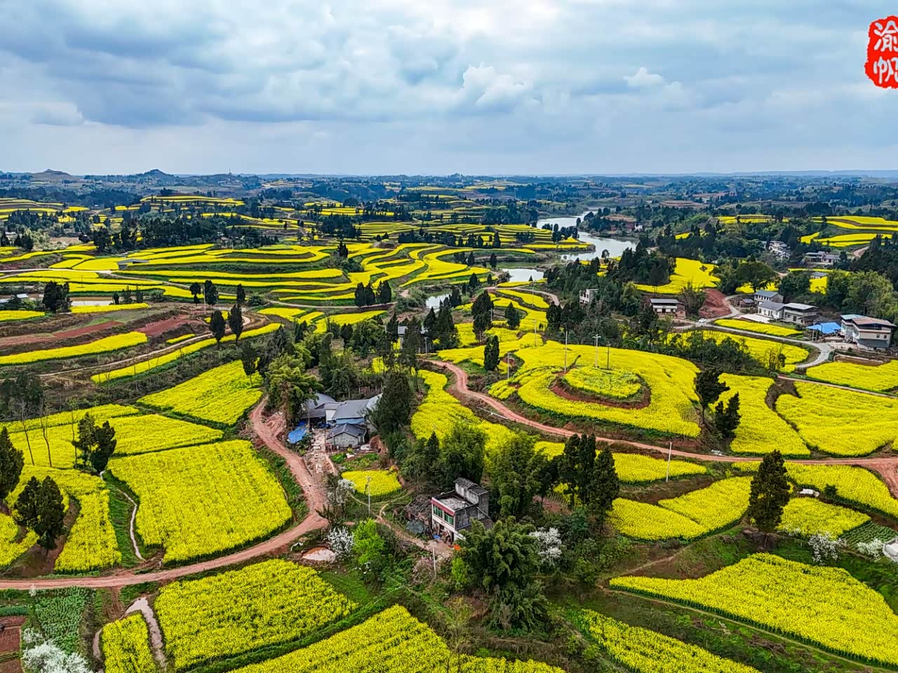 潼南运河畔的高庙村,油菜花开成海,遍地流金,田园阡陌相映如画
