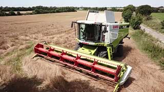 法国滨海夏朗德省的亚麻收割 克拉斯750收割机挂7米5割台作业