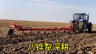 动力强劲的拖拉机牵引八铧液压犁深耕,犁地效果超赞!