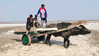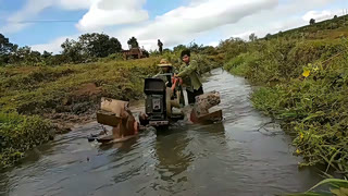 赶着牛车拉着单杠柴油机抽水浇灌农田