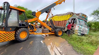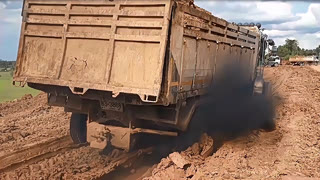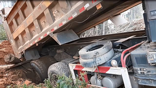 大货车超载陷泥坑,越折腾陷得越深,无奈只能原地卸货