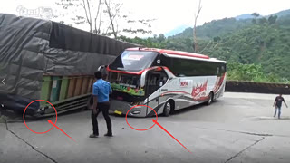 大货车卡在弯道上,随时有翻车的危险,大巴车司机太大胆了