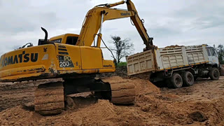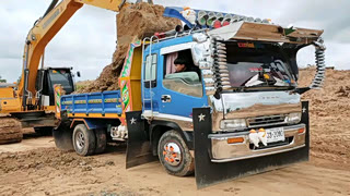 货车装太重了,斗顶不起来,找来挖土机帮忙卸土