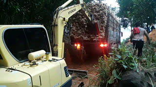 货车木头装太满了,上坡爬不动,挖土机来帮忙!