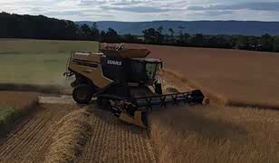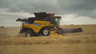 纽荷兰大黄蜂CR990执行麦收任务 落日衬托下更显机械美感