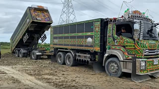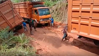 让人绝望的道路,陷进去的卡车还没出来,结果对向卡车又陷了进去