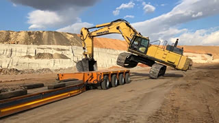 超巨型挖掘机,自行上拖车全过程,非常的惊险!