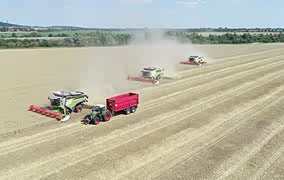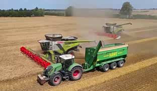3台克拉斯收割机在德国高速路边作业 大地块联合收割任务