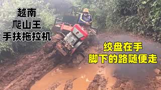 越南山区农民手扶拖拉机运输庄稼,都是泥坑路,这要走到猴年马月
