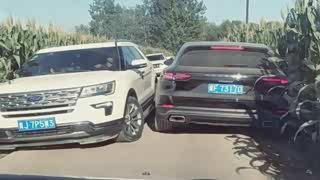农村道路太窄,保时捷遇上了福特,吓得福特老司机都靠边了!