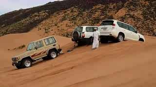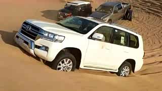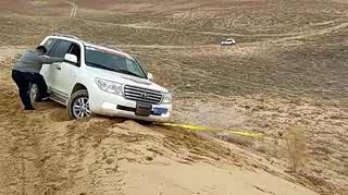 丰田陆巡沙漠陷车后,救援车辆却侧着往坡下拉
