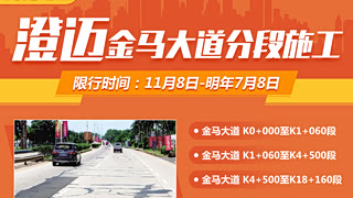 据海南省公安厅交警总队网站获悉,2019年11月8日起澄迈金马大道将分段封闭施工,请各位途径此路段的司机提前做好绕行准备。具体分段施工方案如下: 一、S317金马大道K0+000至K1+060段 2019年11月8日至2019年12月14日,先后封闭S317金马大道K0+000至K1+060段的右幅(金江镇往海口方向)和左幅(海口往金江镇方向)进行施工,期间右幅行驶的车辆经金江镇华兴路、文化北路通行;左幅行驶的车辆11月8日至11月26日正常通行,11月27日至12月14日向右幅借道通行。 2019年12月15日至2019年12月30日,封闭S317金马大道K0+000至K1+060段全幅,来往车辆经金江镇华兴路、文化北路双向通行。 二、S317金马大道K1+060至K4+500段 2019年11月10日至2020年3月30日,交替封闭S317金马大道K1+060至K4+500段左右幅,5吨(含)以下车辆经未封闭的另一幅双向通行,5吨以上车辆经S303屯大线往G225海榆西线通行。 三、S317金马大道K4+500至K18+160段 2019年11月8日至2020年7月8日,滚动式交替封闭S317金马大道K4+500至K18+160段左右幅(每次作业长度不超过3公里),5吨(含)以下车辆经未封闭的另一幅双向通行,5吨以上车辆经S303屯大线往G225海榆西线通行。