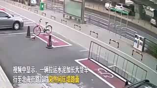 监控实拍:货车压塌路面,瞬间断轴爆胎、现场白烟四起