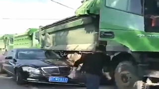 大货车表示无辜,是奔驰自己撞成这样的,我可啥都没动