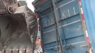 来自广西挖机救援货车,把货车的车厢怼凹进去了,佩服!