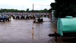 一场大雨过后,印度的拖拉机仓库被淹,工人们正在转移拖拉机