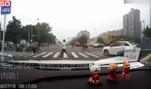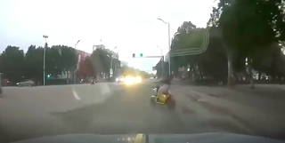 行车记录仪:女司机骑着电动车闯红灯,一个喇叭吓到弃车保命