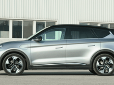 车身侧面,车门上使用的是伸缩式隐藏把手,在高速行驶的时候还能降低风噪;后车窗采用了隐私玻璃,坐在后排非常有神秘感;前翼子板两侧都有充电口,分别是快充和慢充。底部21寸双色花瓣式大轮毂,搭配的是米其林PS4