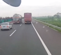 油罐车要超车,红色车提速了,行车记录仪拍下精彩瞬间