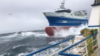 苏格兰渔船在西北大西洋汹涌大海和巨浪中前行,光看着都晕船了