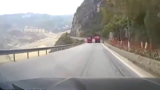 跑山路突然对面冲出两辆货车,单行道了?监控拍下全过程