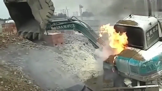 男子:灭不了火了,就地掩埋吧,挖掘机:求求你救救我