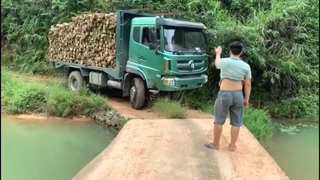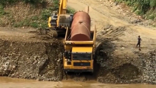 四川卡车过河,挖掘机保驾护航,确保安全过河,施工人员真不容易