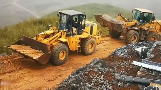 两辆50吨重型铲车,合力用牵引绳托运卡车