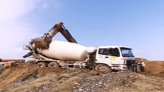 惊险一幕!工地挖机伸出大大的怀抱助力罐车