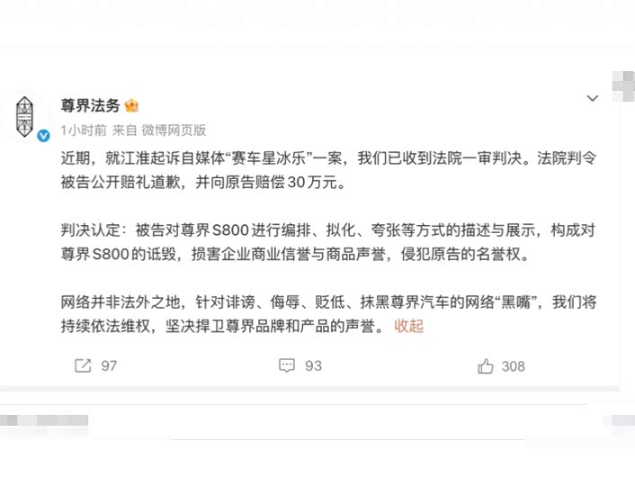 尊界起诉自媒体"赛车星冰乐"胜诉,获赔30万元