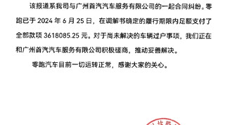 9月27日11点17分,@零跑汽车 发布声明,回应被列为失信被执行人事件,声明内容如下: “昨日,我们关注到关于我司因业务纠纷被强制执行的报道。对此,我们高度重视,特说明如下: 该报道系我司与广州首汽汽车服务有限公司的一起合同纠纷。零跑已于2024年6月25日,在调解书确定的履行期限内足额支付了全部款项 3618085.25元。 对于尚未解决的车辆过户事项,我们正在和广州首汽汽车服务有限公司积极磋商,推动妥善解决。零跑汽车目前一切运转正常,感谢大家的关心。” 从零跑汽车回应声明来看,欠款已经还清,只是73辆车过户手续尚未解决。是什么原因导致,361.8万欠款都还了,车辆却不收回呢?不会造成资产损失吗?