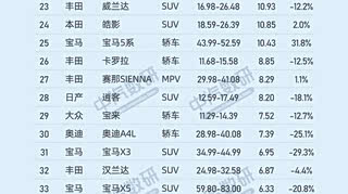 1-11月合资品牌燃油车不分车型销量榜统计,几个看点:一、既延续日系德系主导市场,且主要是丰田和大众为主。除了第一名日产轩逸,后面10款车型里大众占据6席,丰田占4位。二、本田卖得最多的是CR-V,排在第12位,同比下滑4.5%。三、美系靠着别克的一口价还有提升,而韩系、法系彻底边缘化了。