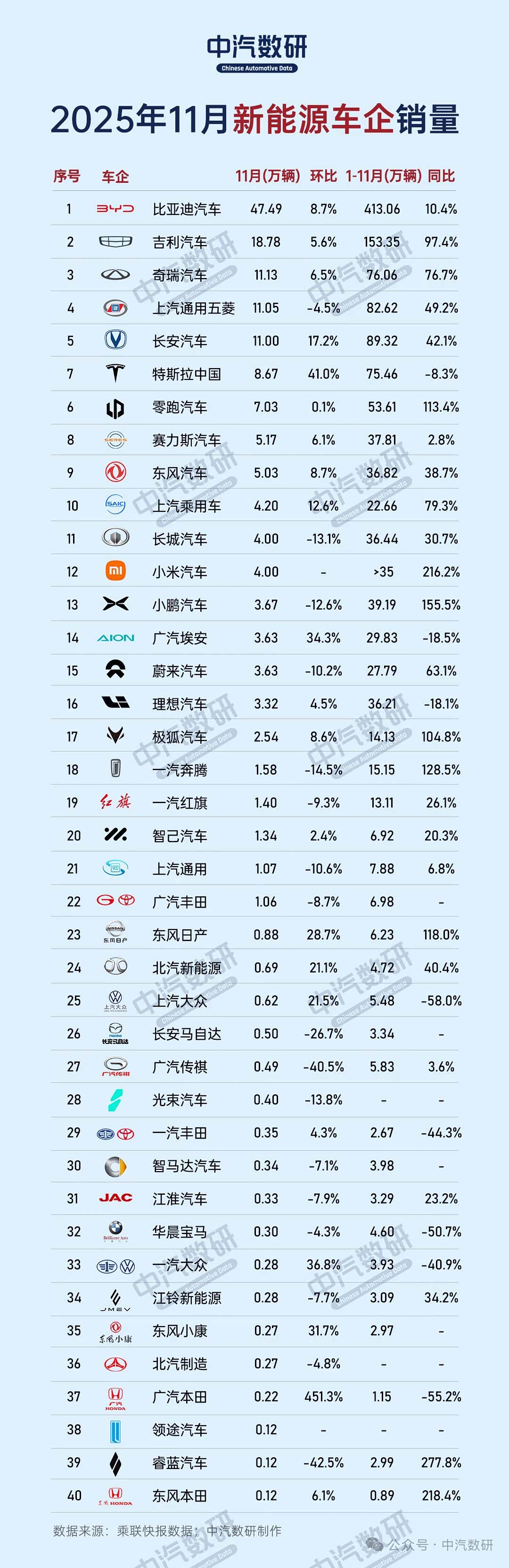 吉利汽车公布了2025年11月最新销量数据,吉利汽车集团当月销量为31.04万辆,创有史以来单月销量历史新高。其中吉利银河,11月实现销量13.26万辆,前11个月累计销量超113.5万辆,同比增长167%。领克品牌11月销量3.5万辆,大六座SUV领克900表现不错,上市6个月交付破5万辆,领克今年累计销量已经超过30万辆。极氪品牌11月销量为2.88万辆,其中,最新旗舰SUV极氪9X交付已超过万台,并且该车的单车成交均价达到53.8万,极氪的高端化已经得到市场认可。 海外市场方面,11月吉利出口销量为4.2万辆,虽然同比增长22%,但总量远不及比亚迪海外销量。截止目前,2025年1-11月,吉利汽车集团累计销量为278.77万辆,比亚迪集团累计销量为418.2万辆。今年吉利一直处于追赶之势,大家认为2026年吉利能超过比亚迪吗?